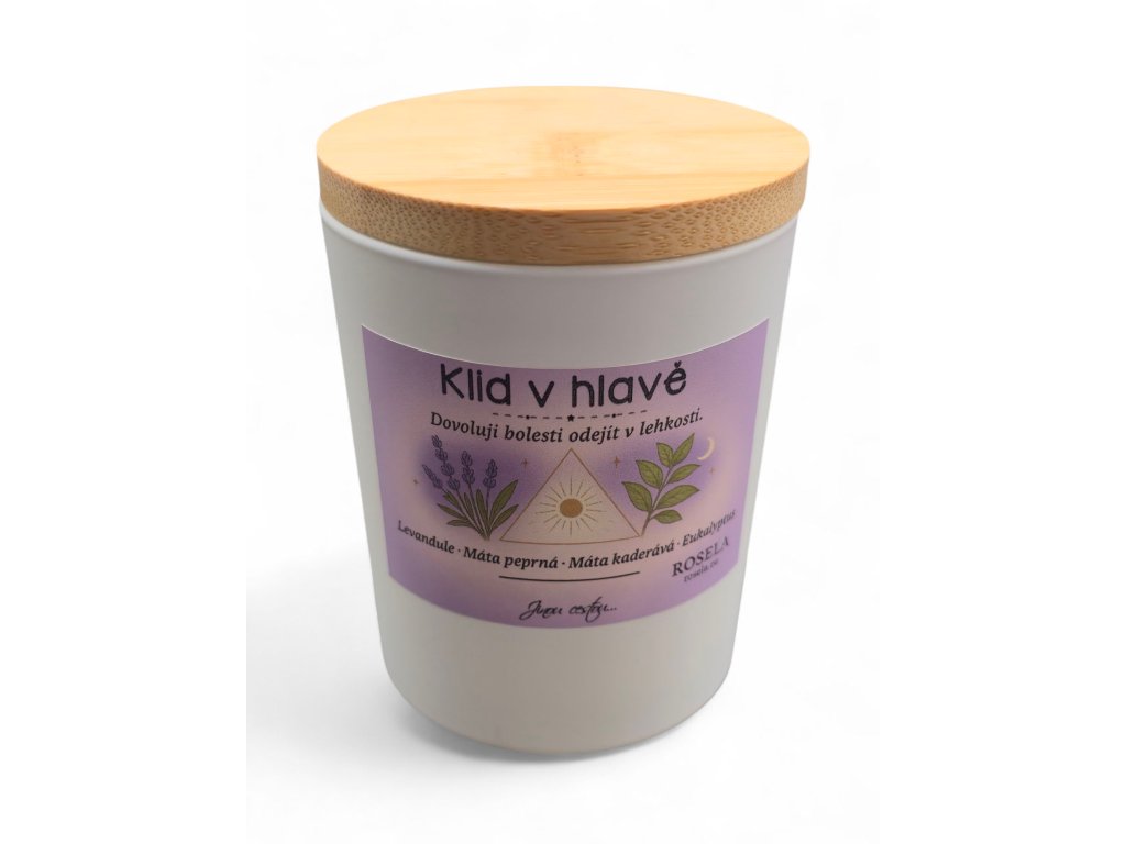 Svíčka Klid v hlavě je vytvořena pro okamžiky, kdy je potřeba ztišit mysl a uvolnit napětí. Kombinace levandule, máty peprné, máty kadeřavé a eukalyptu působí svěže, čistě a chladivě. Vůně je jako jemný vánek, který pročistí prostor i vaši mysl. Každá svíčka je ručně odlévaná ze sojového vosku a obohacená směsí esencí, jež podporují pocit lehkosti a zklidnění.